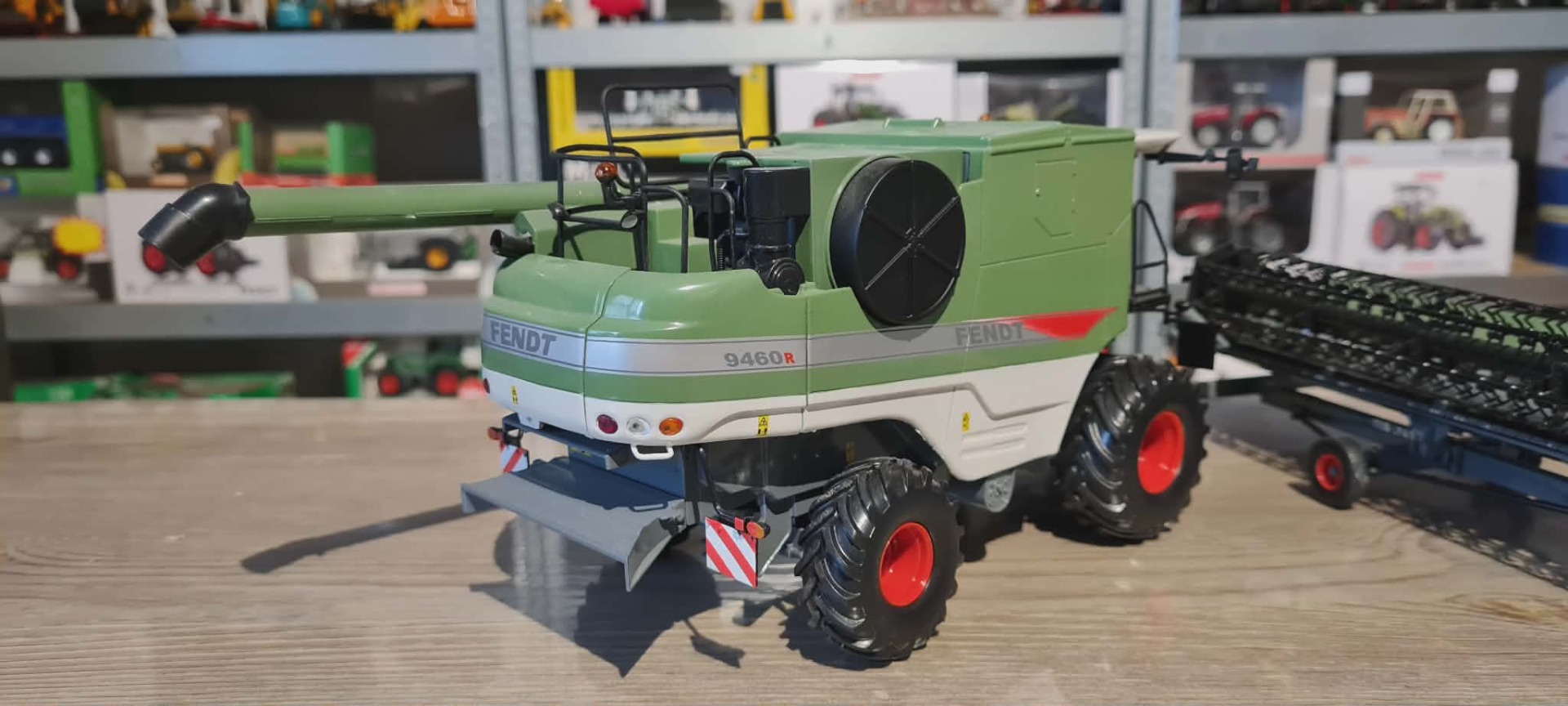 Fendt 9460R maaidorser met maaibord en transportwagen.